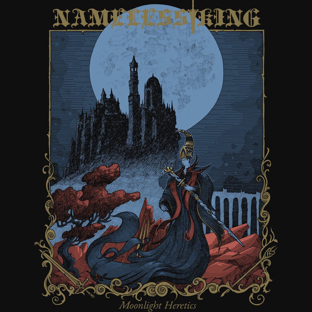 Despite having a long history with video and pc gaming, I must confess I have never played any of the Dark Souls games, including predecessors or successors. The meta surrounding such games simply isn’t my thing, but the dark fantasy setting where merciless demigods reign and grim heroes follow their trail of hubris speaks to me. Nameless King offers us an audial glimpse of what such a world could sound like, as the artist takes his inspiration solely from this series. I might do one or more reviews about his previous releases later on, but for now I will write about his most recent work (and, coincidentally, the most recent release of my modest list of reviews). Nameless King has created releases both darker and sorrowful. There’s still darkness and sadness to be found in this release, yet he decided to do things differently for Moonlight Heretics. The evocative artwork by VojtÄ›ch Doubek is the first remarkable change. He traded photo manipulations and paintings for drawings which wouldn’t look out of place in a stylistic comic book, which I mean as a compliment.